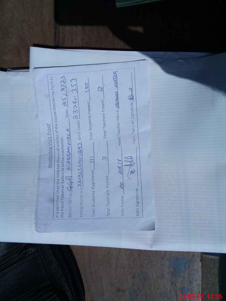 | Attendance Register | Head Teacher | MEA with School | Visit Proof |