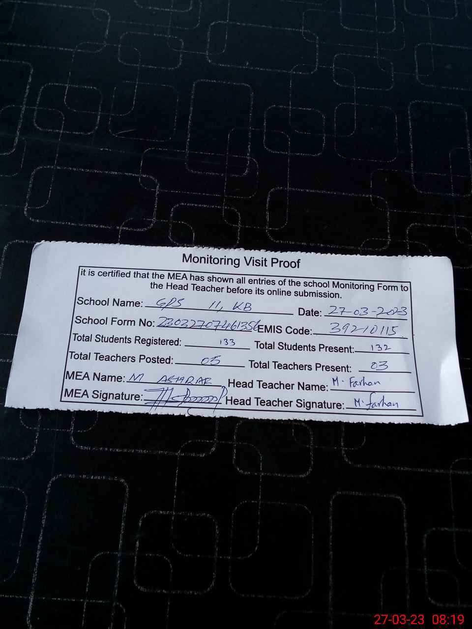 | Attendance Register | Head Teacher | MEA with School | Visit Proof |