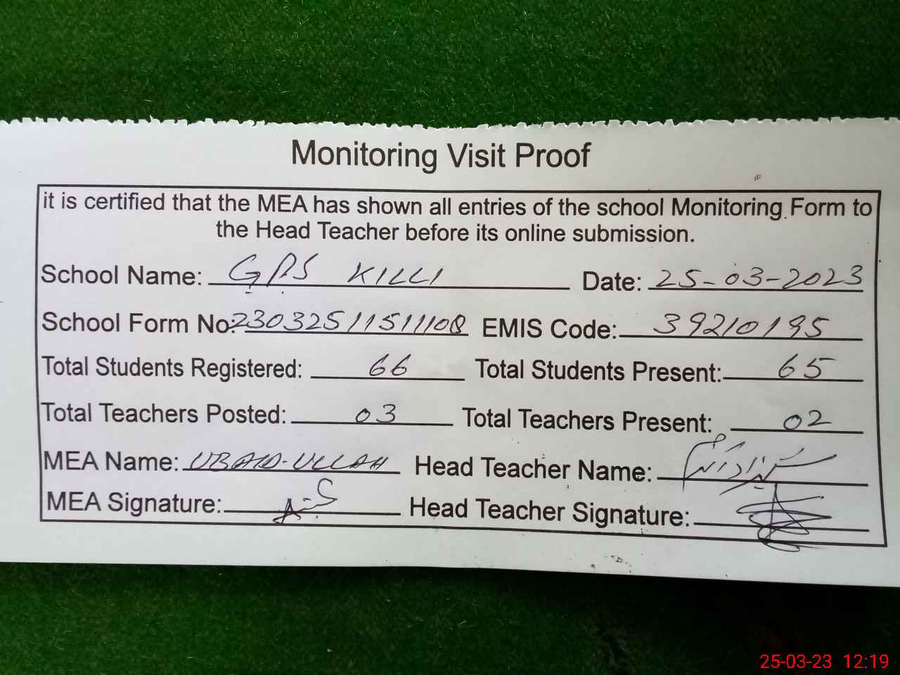 | EMIS Code: 39210195 | Name of School: GPS KILLI PO PAKPATTAN | |||