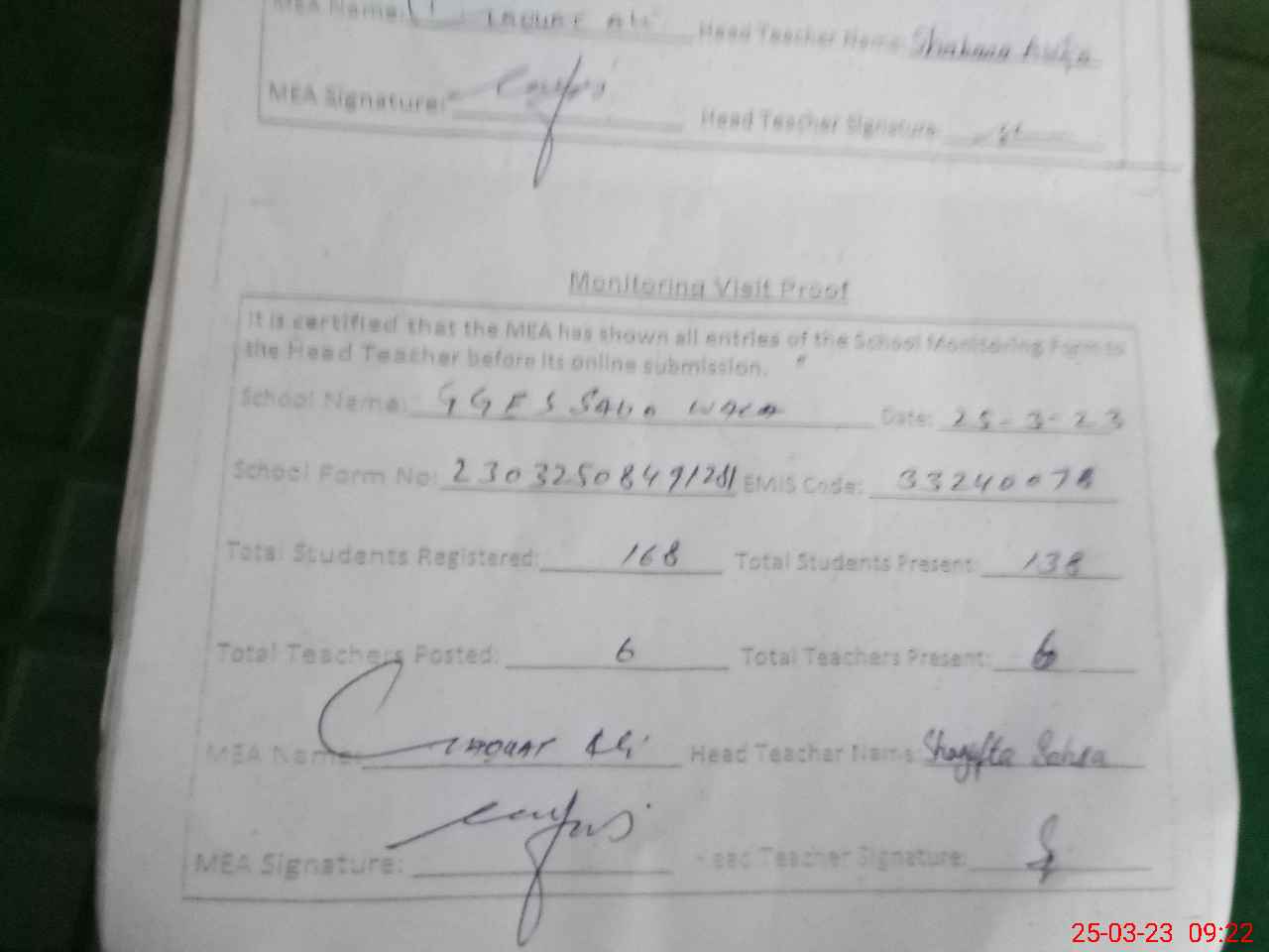 | Attendance Register | Head Teacher | MEA with School | Visit Proof |
