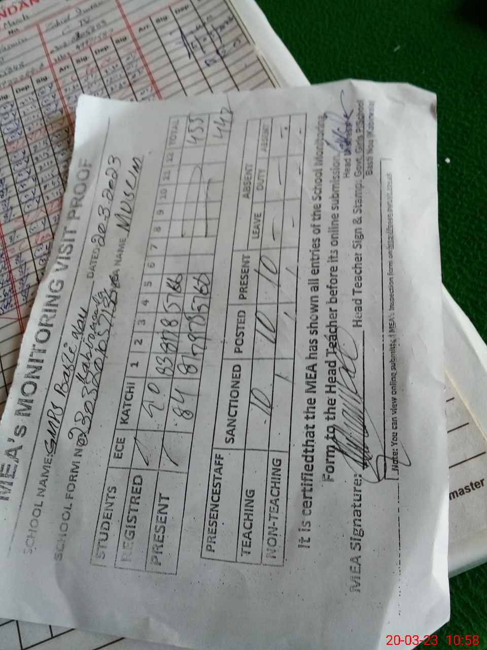 | Attendance Register | Head Teacher | MEA with School | Visit Proof |