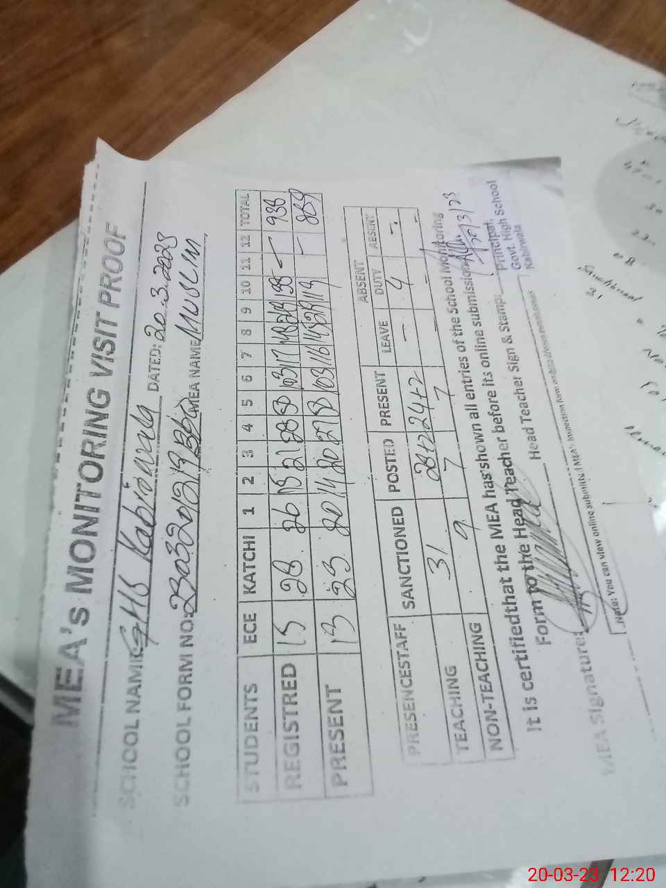 | Attendance Register | Head Teacher | MEA with School | Visit Proof |