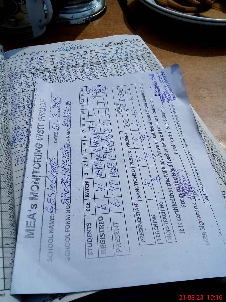 | Attendance Register | Head Teacher | MEA with School | Visit Proof |
