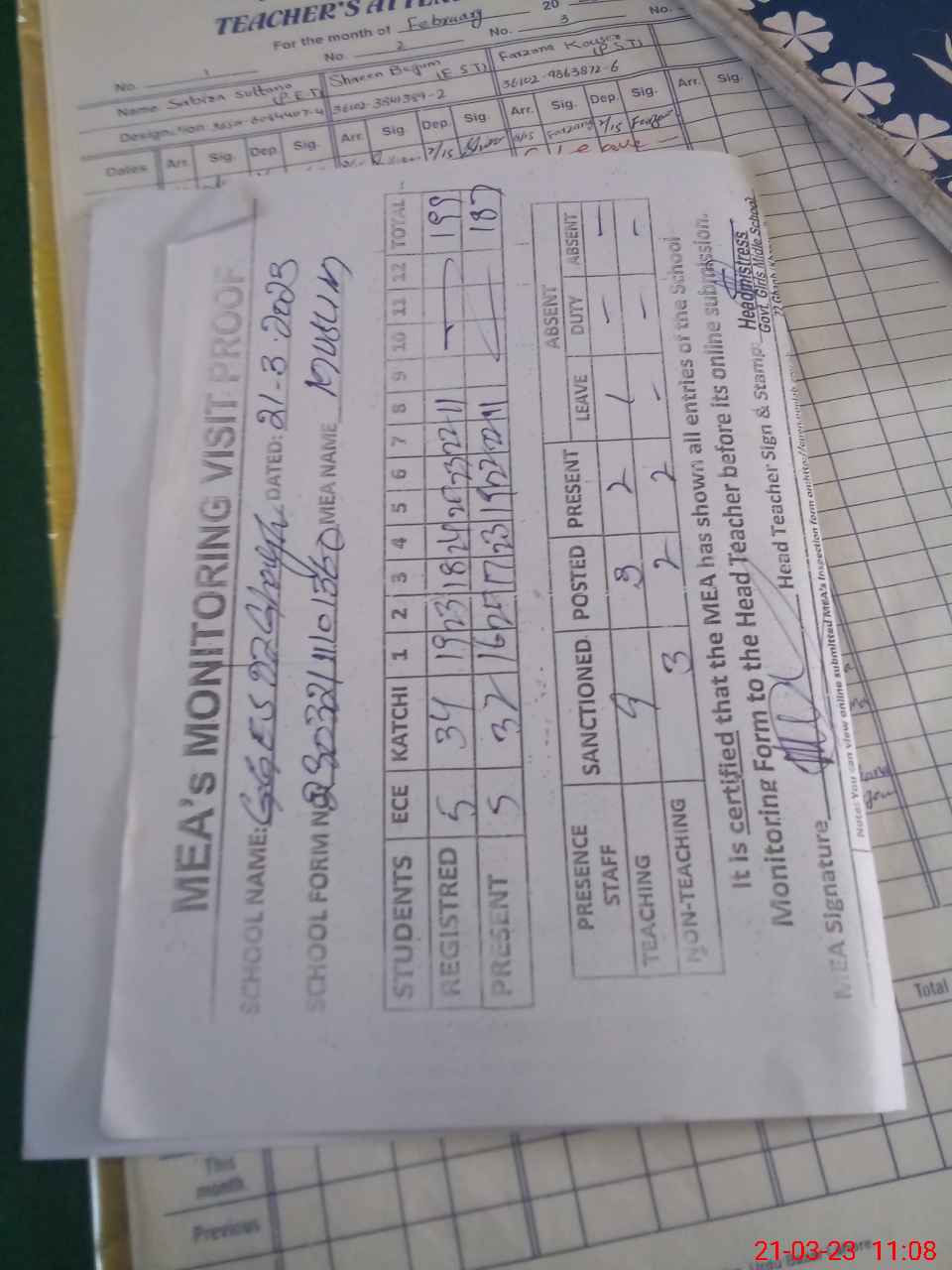 | Attendance Register | Head Teacher | MEA with School | Visit Proof |