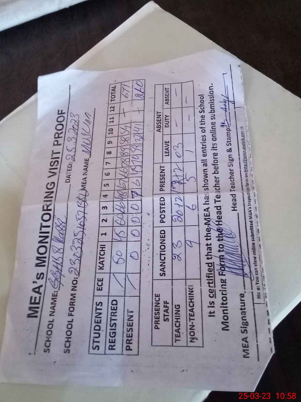 | Attendance Register | Head Teacher | MEA with School | Visit Proof |