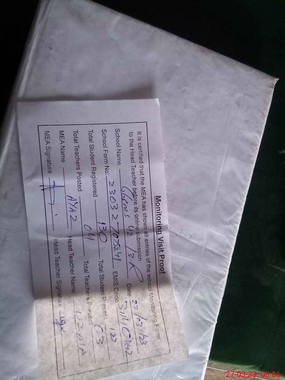 | Attendance Register | Head Teacher | MEA with School | Visit Proof |