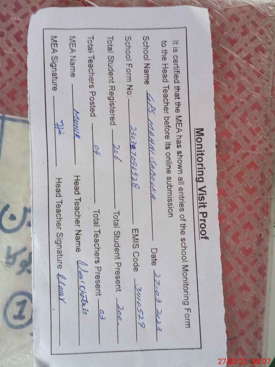 | Attendance Register | Head Teacher | MEA with School | Visit Proof |