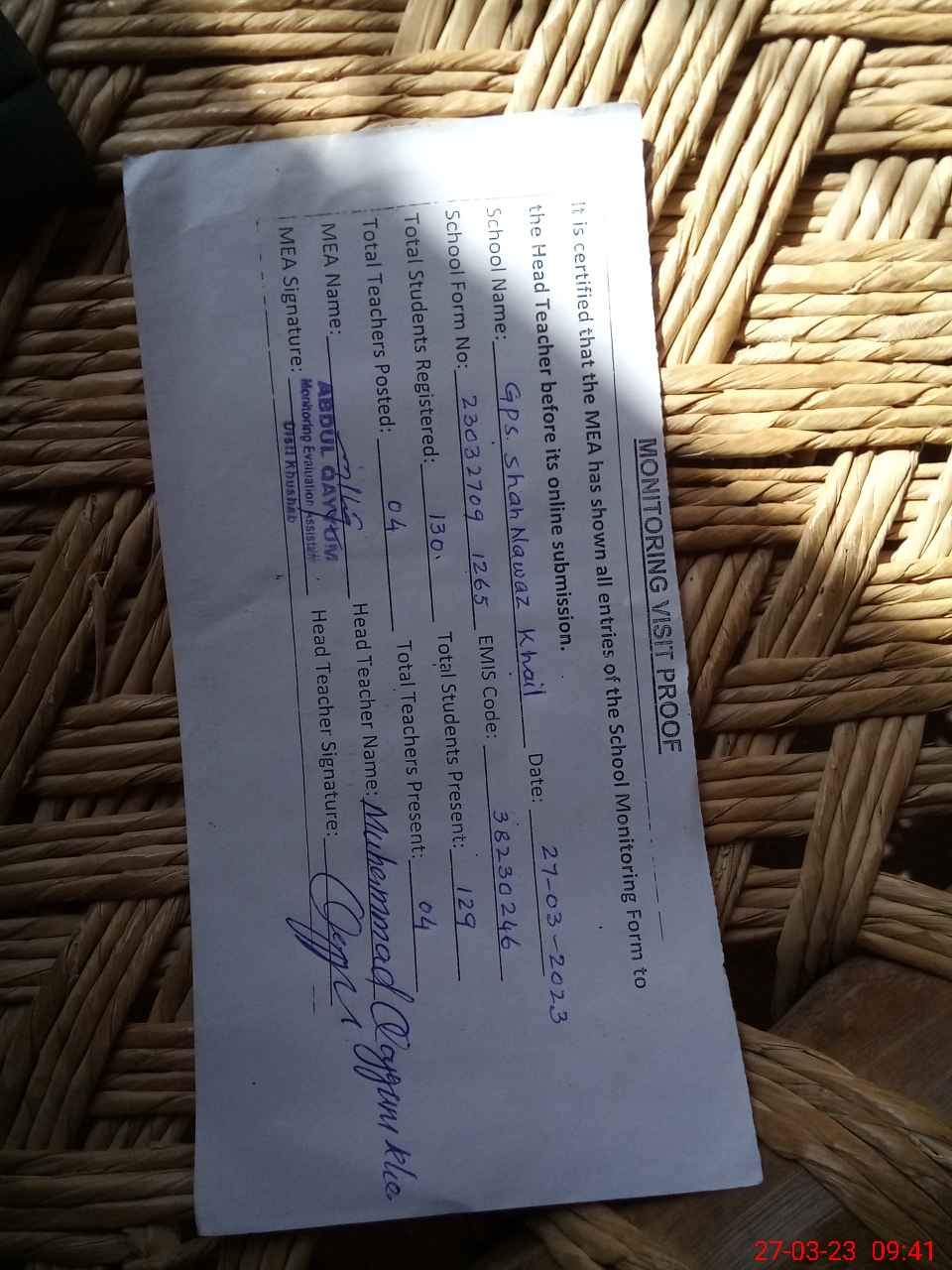 | Attendance Register | Head Teacher | MEA with School | Visit Proof |