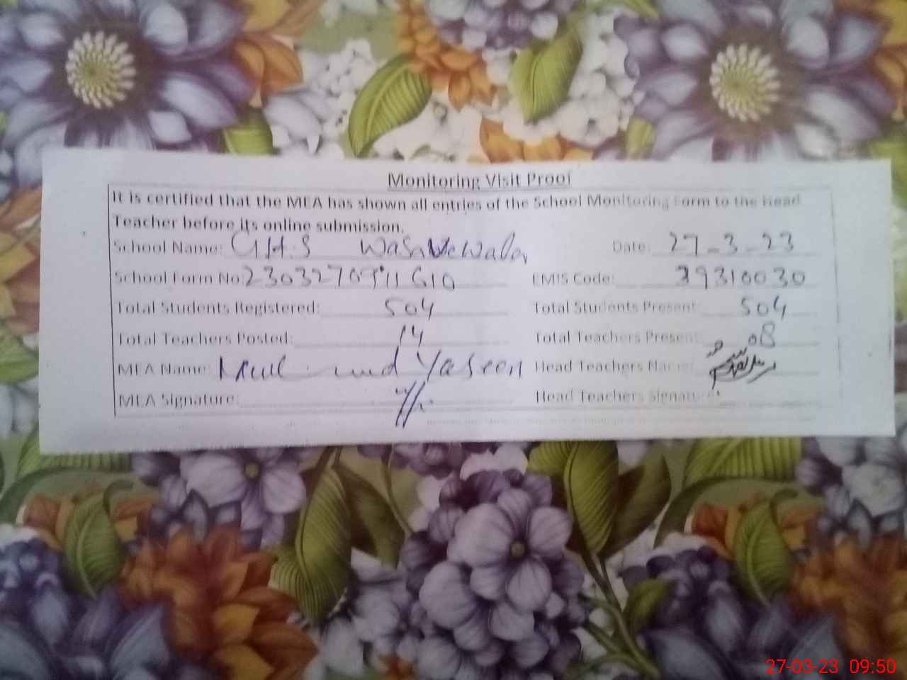 | EMIS Code: 39310030 | Name of School: GHS WASAWEY WALA | |||