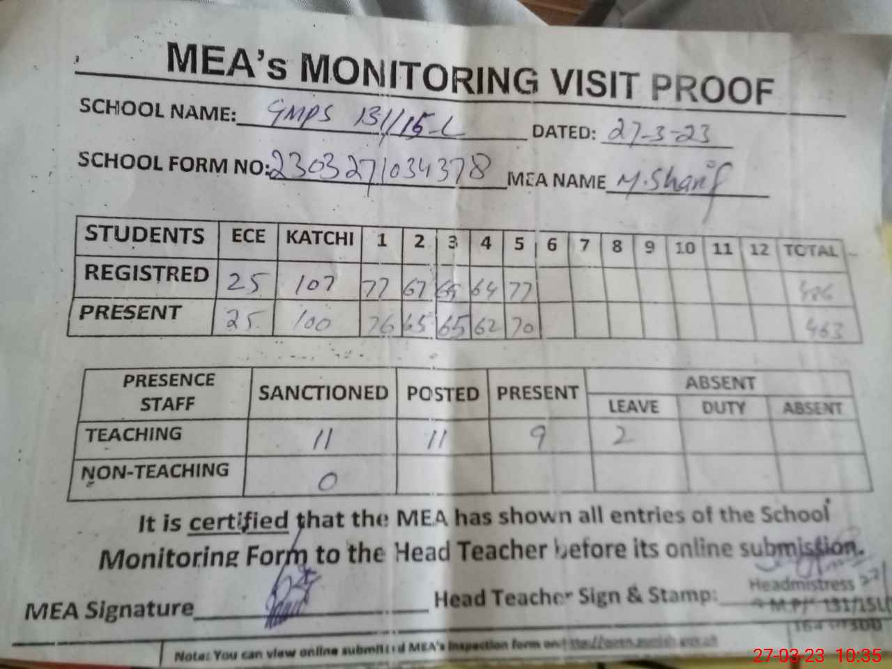 | Attendance Register | Head Teacher | MEA with School | Visit Proof |