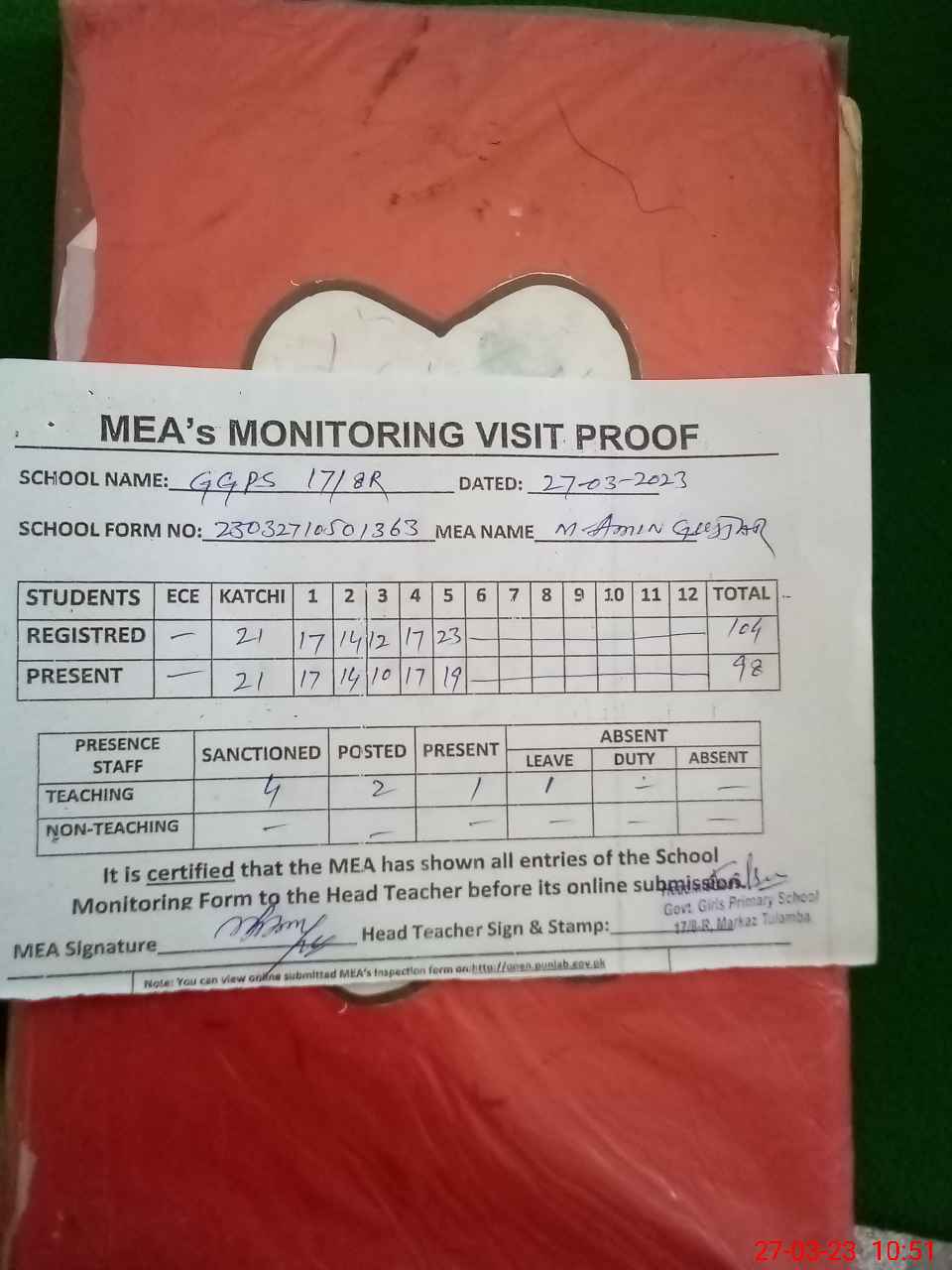| Attendance Register | Head Teacher | MEA with School | Visit Proof |