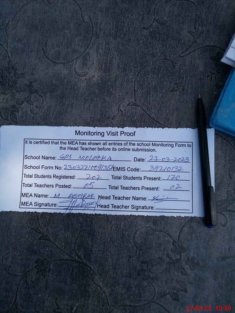 | Attendance Register | Head Teacher | MEA with School | Visit Proof |
