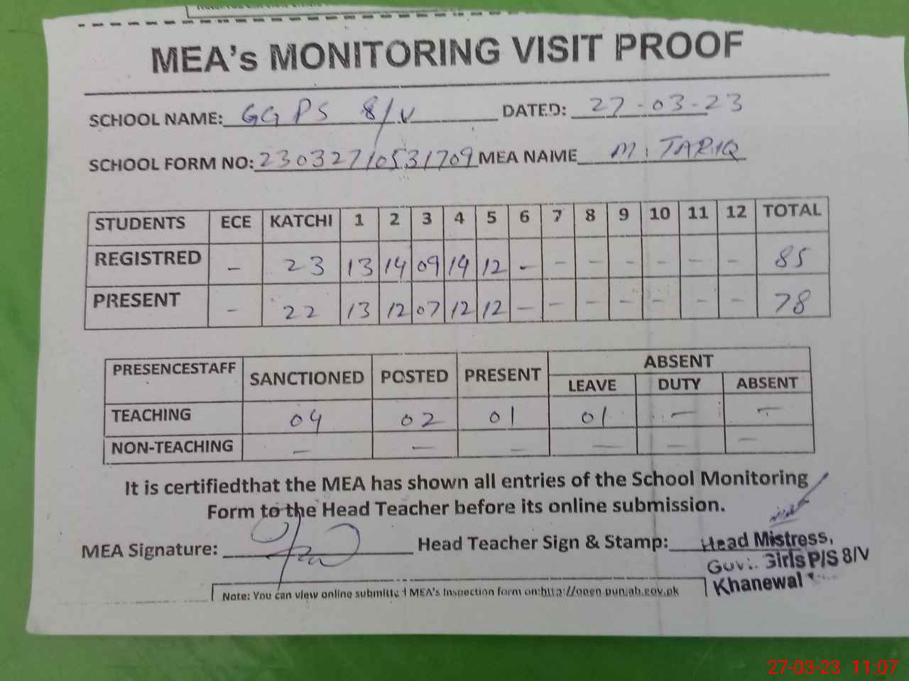 | Attendance Register | Head Teacher | MEA with School | Visit Proof |