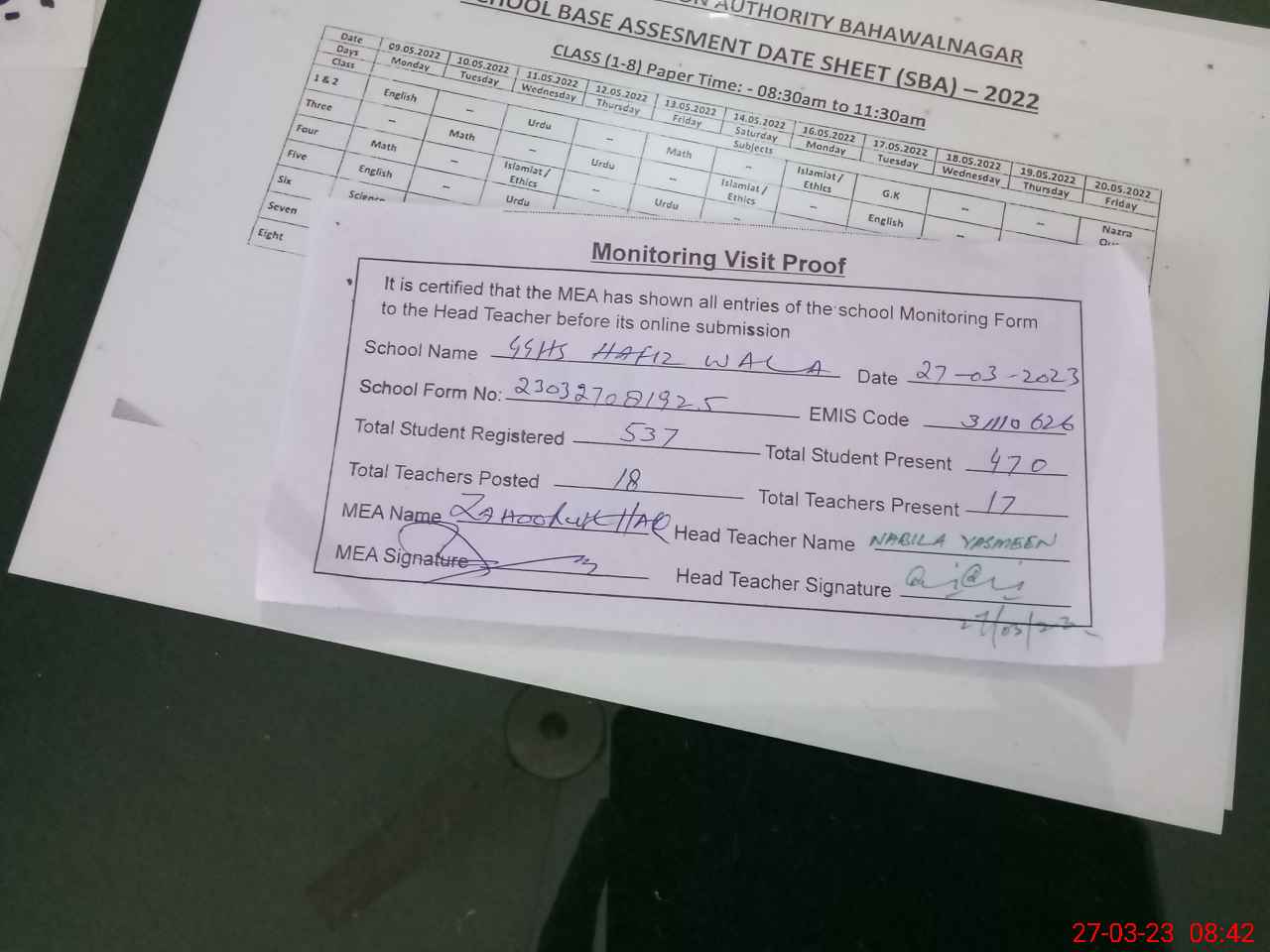 | Attendance Register | Head Teacher | MEA with School | Visit Proof |