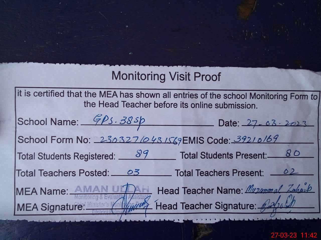 | EMIS Code: 39210169 | Name of School: GPS 38 SP | |||