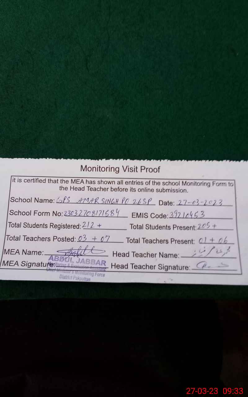 | EMIS Code: 39210453 | Name of School: GPS AMAR SINGH P/O 26/S.P PAKPATTAN | |||