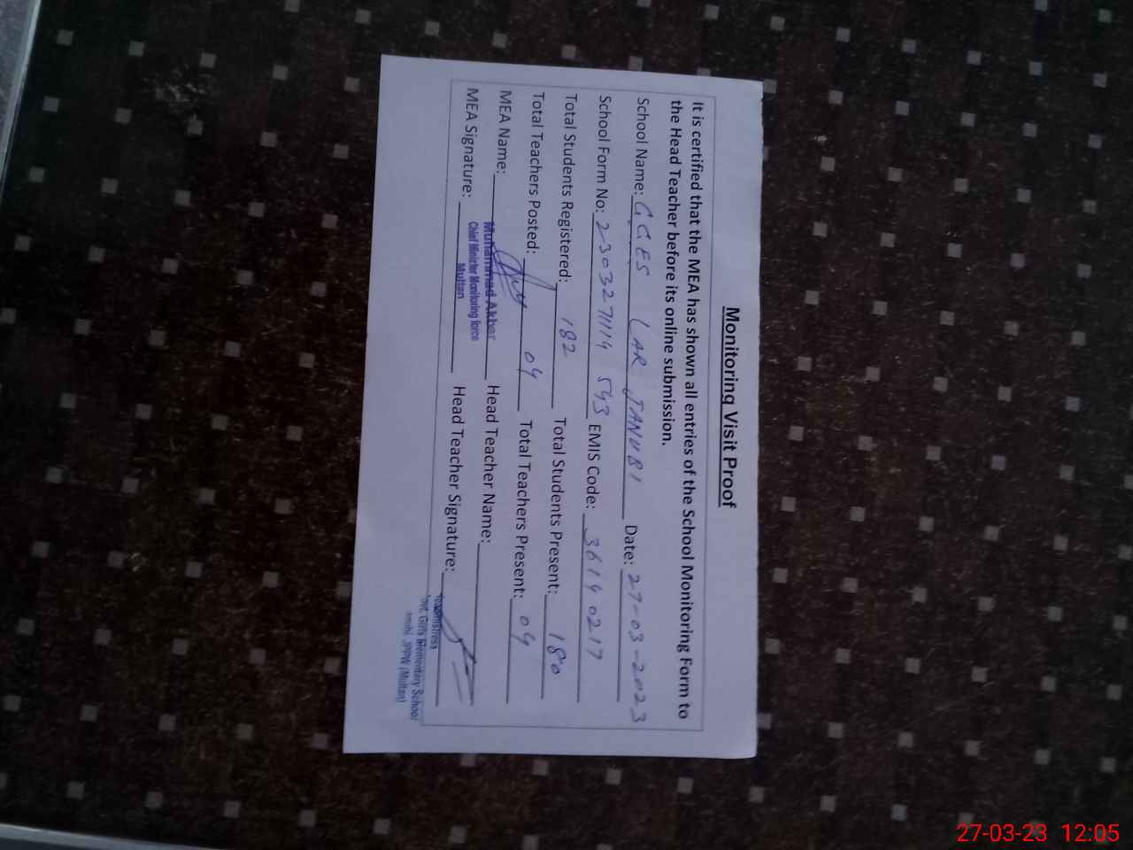 | Attendance Register | Head Teacher | MEA with School | Visit Proof |