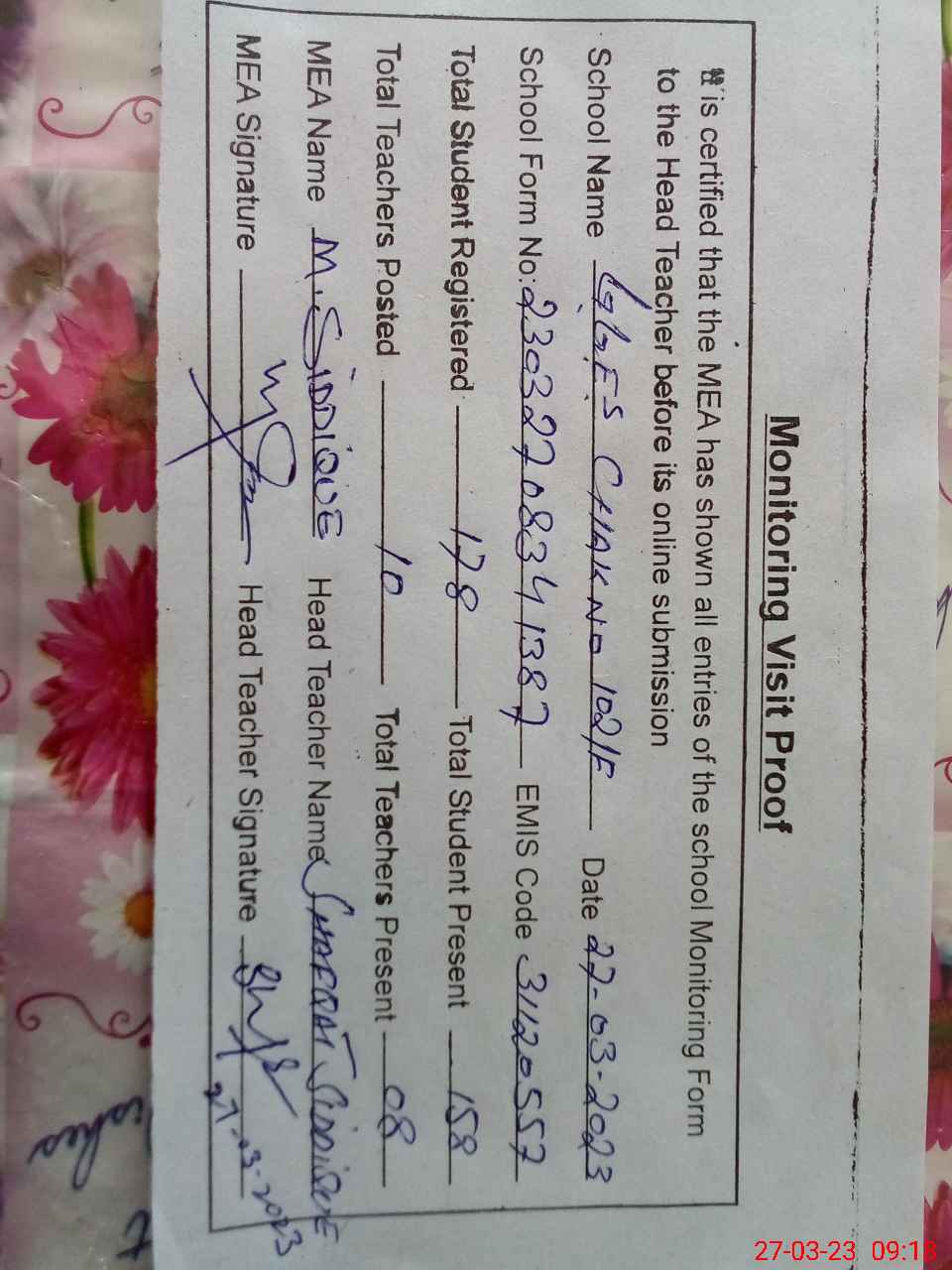 | Attendance Register | Head Teacher | MEA with School | Visit Proof |