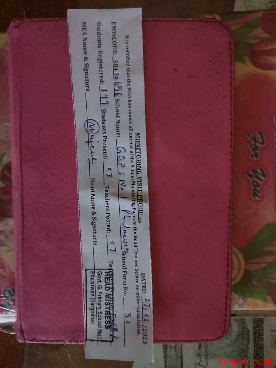 | Attendance Register | Head Teacher | MEA with School | Visit Proof |