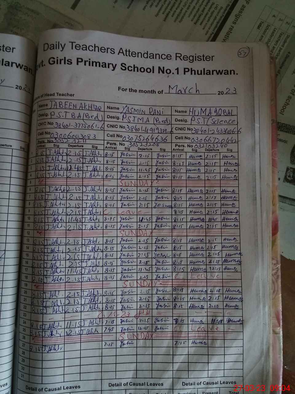 | CNIC | Full Name | Designation | R/C | Absence During Last Calender Month |
