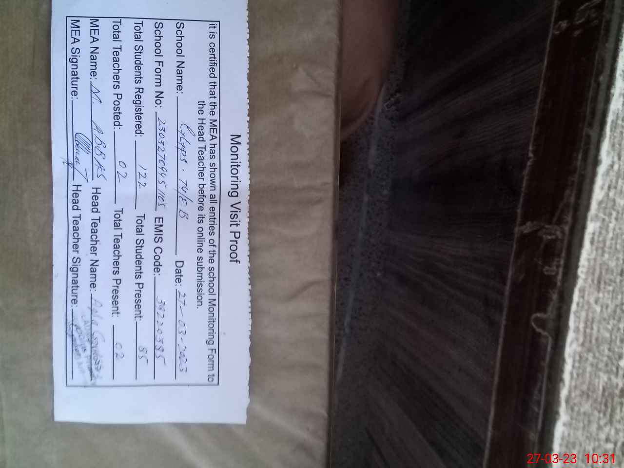 | Attendance Register | Head Teacher | MEA with School | Visit Proof |