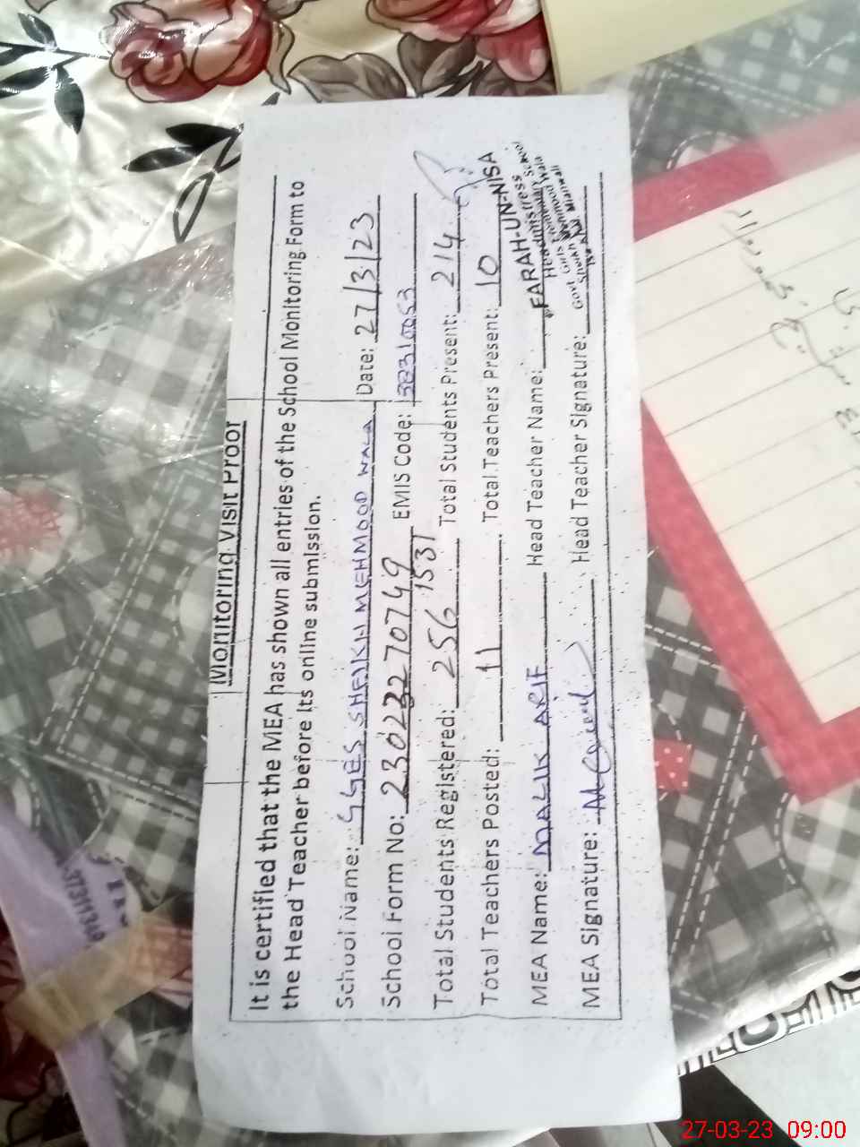 | Attendance Register | Head Teacher | MEA with School | Visit Proof |