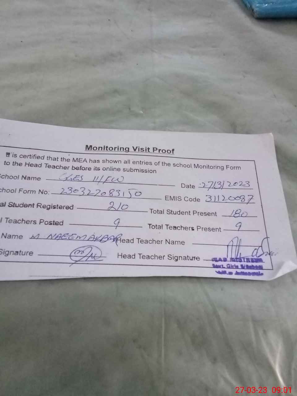 | Attendance Register | Head Teacher | MEA with School | Visit Proof |