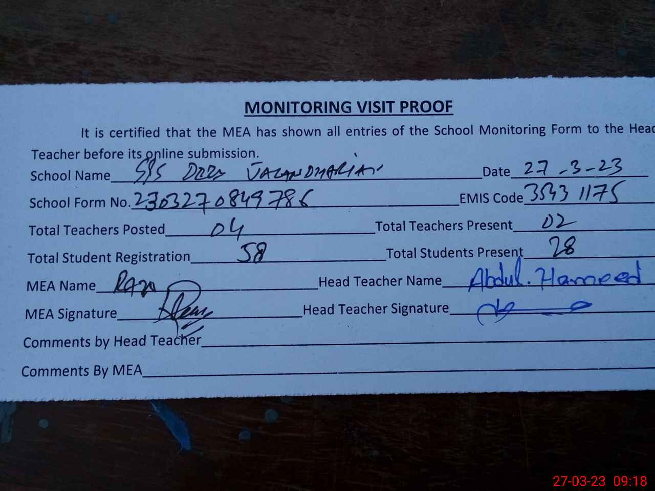 | EMIS Code: 35431175 | Name of School: GPS DERA JALANDRIAN | |||