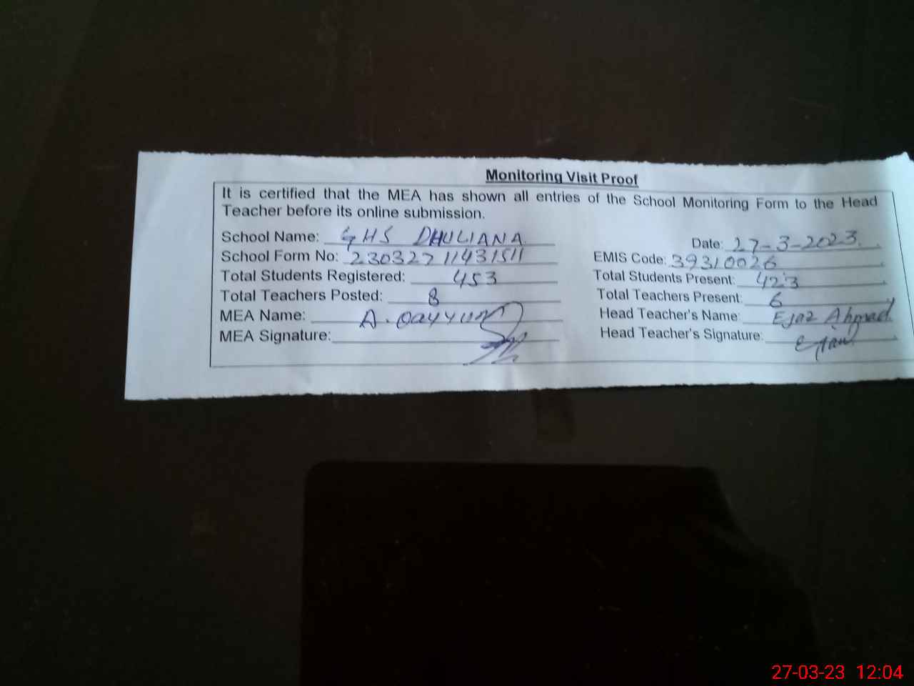 | Attendance Register | Head Teacher | MEA with School | Visit Proof |