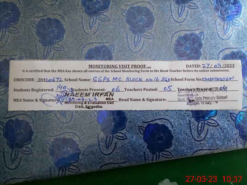 | EMIS Code: 38420672 | Name of School: GGPS MC BLOCK NO.16 SARGODHA | |||
