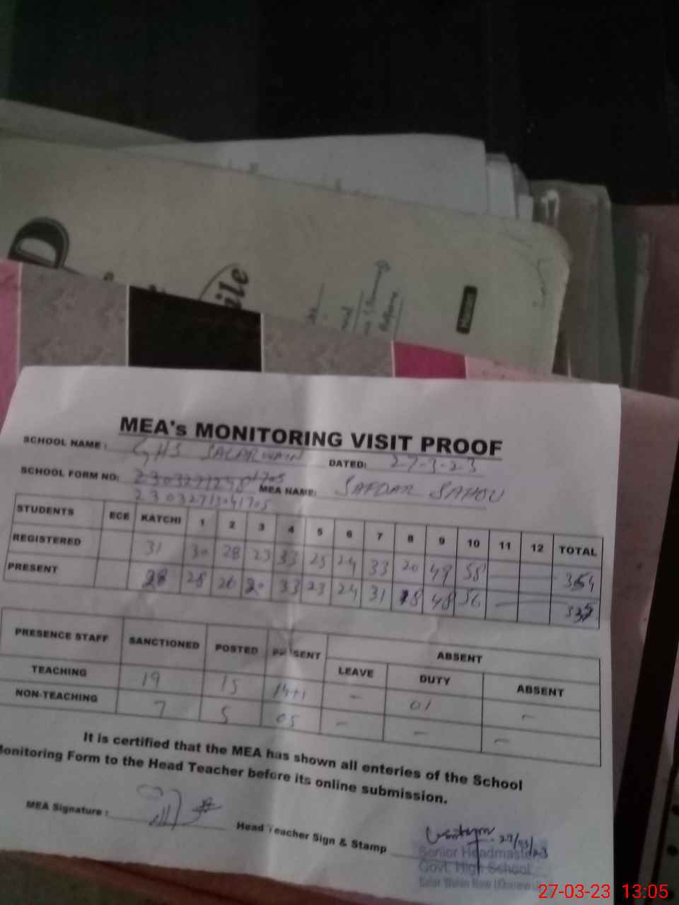 | Attendance Register | Head Teacher | MEA with School | Visit Proof |