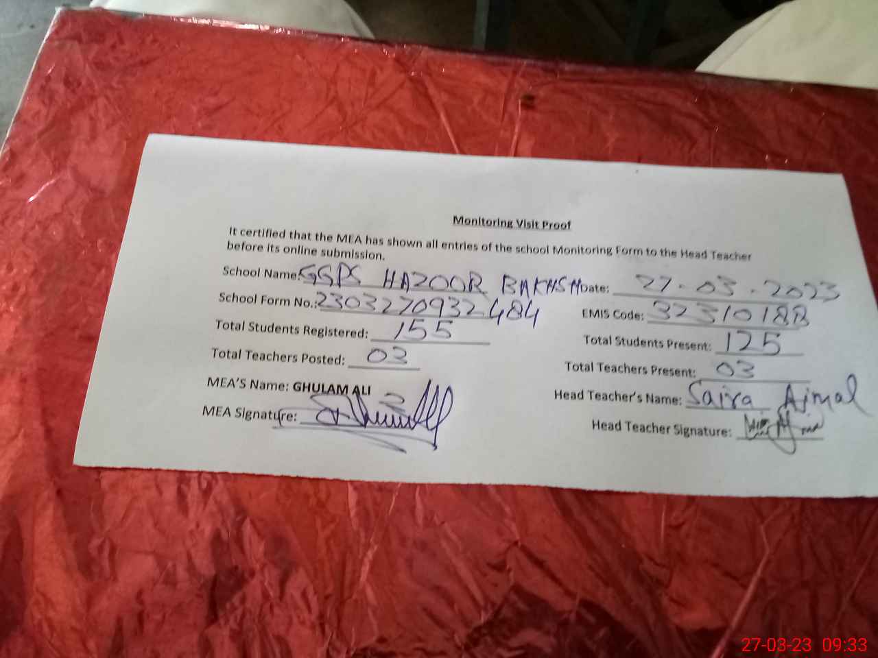 | EMIS Code: 32310188 | Name of School: GGPS HAZOOR BAKHSH | |||