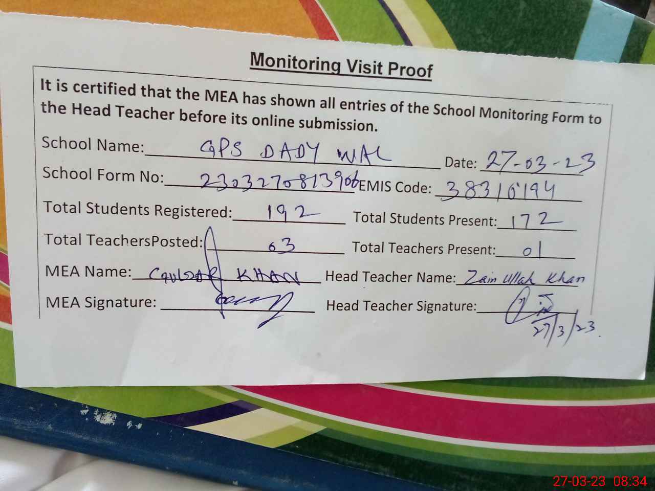 | Attendance Register | Head Teacher | MEA with School | Visit Proof |