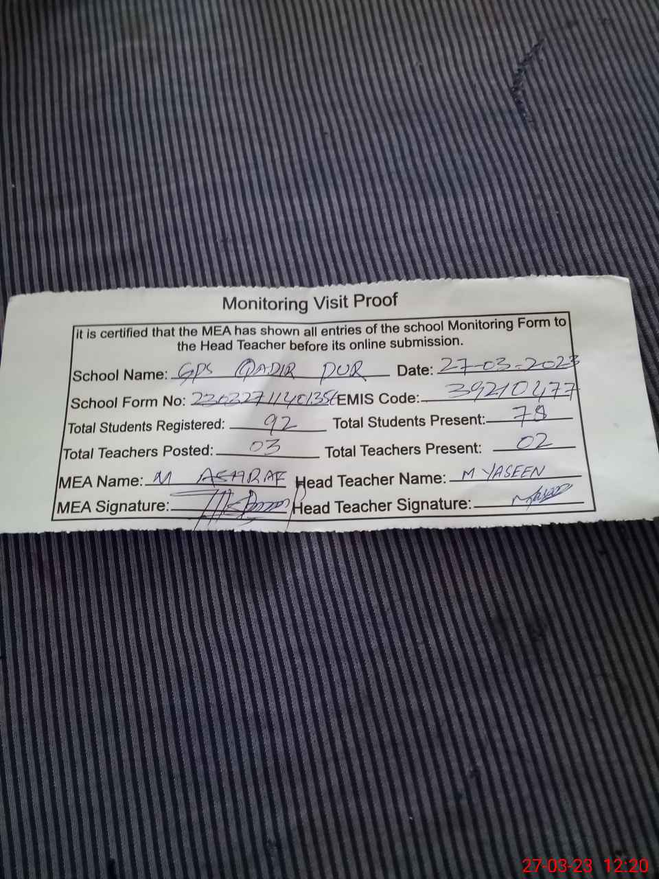 | EMIS Code: 39210477 | Name of School: GPS QADIR PUR | |||