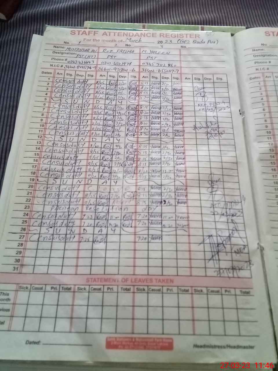 | Name: Mu**** Al**** Designation: (School Headmaster's/Headmistress's) PST Phone/Cell Number: 03**** |