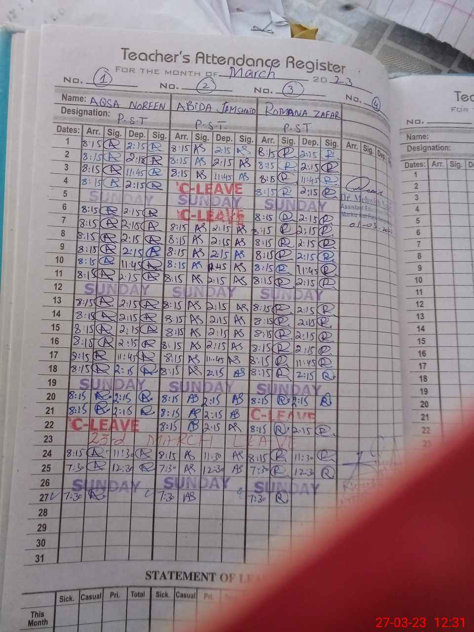 | Leave | Duty | Absent | Maternity | Medical | Ex- Pak |