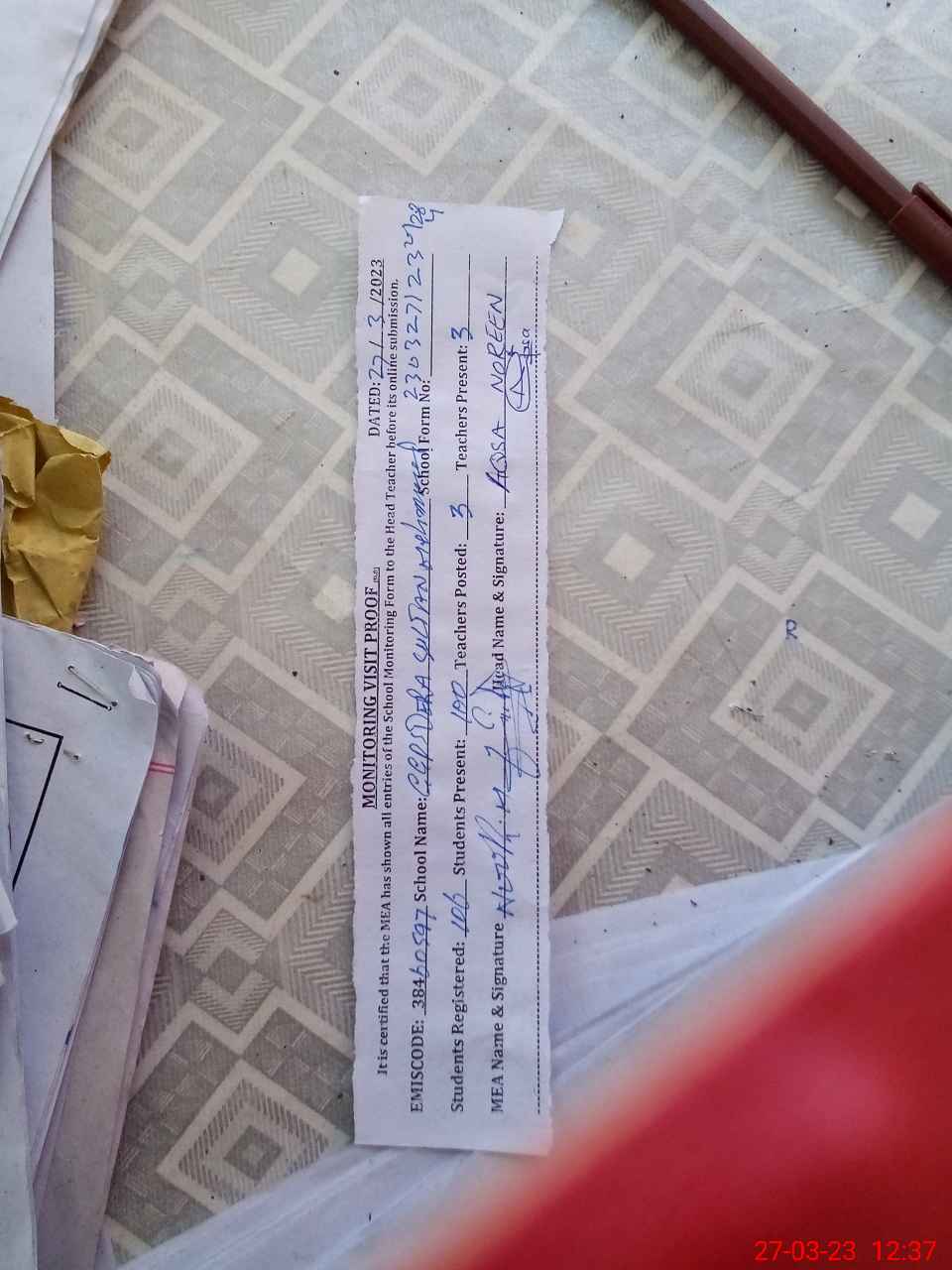 | Attendance Register | Head Teacher | MEA with School | Visit Proof |
