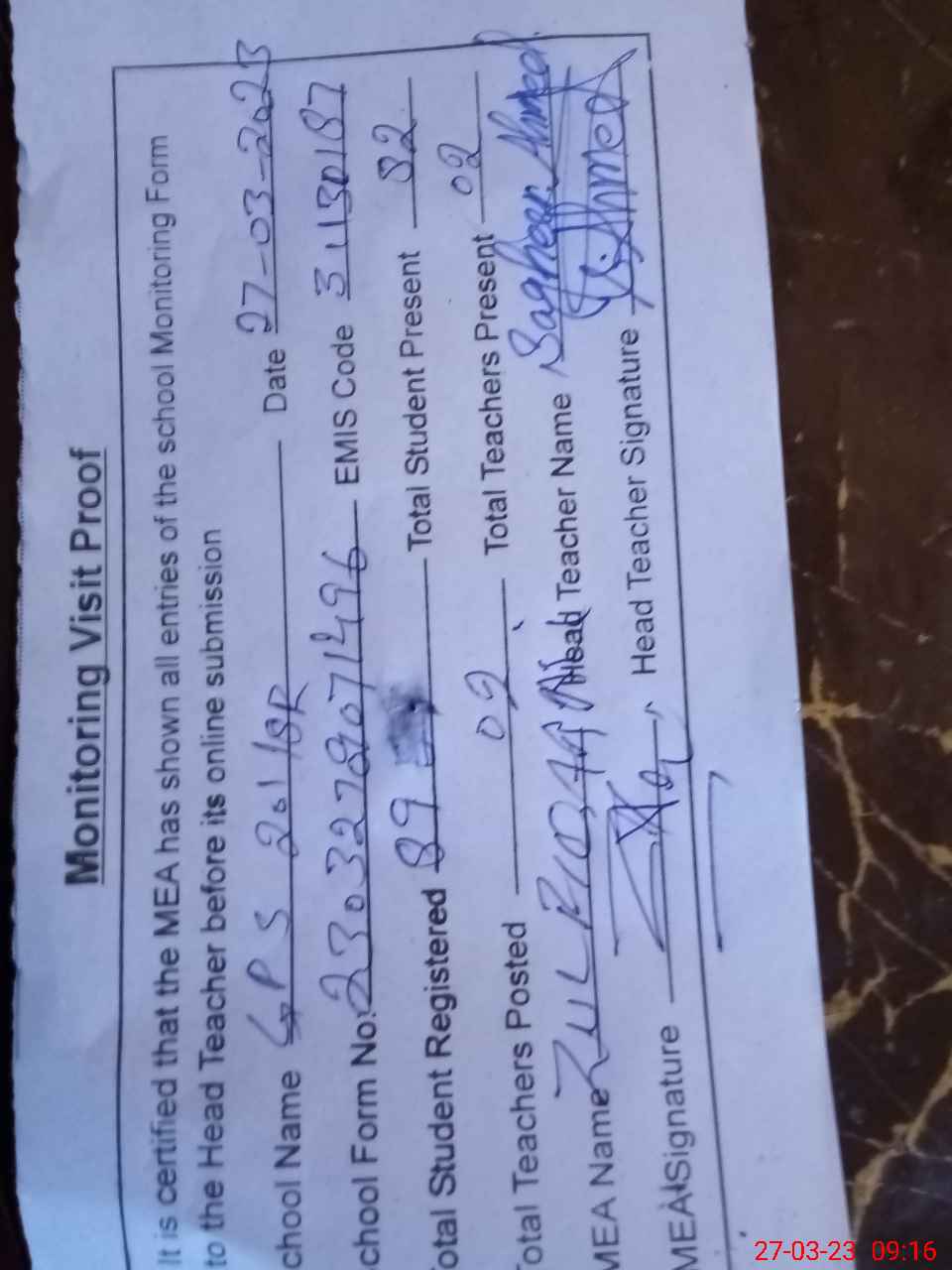 | Attendance Register | Head Teacher | MEA with School | Visit Proof |