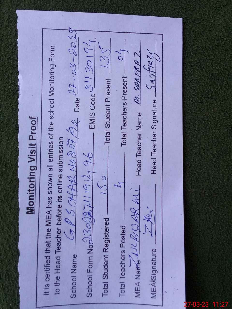 | Attendance Register | Head Teacher | MEA with School | Visit Proof |