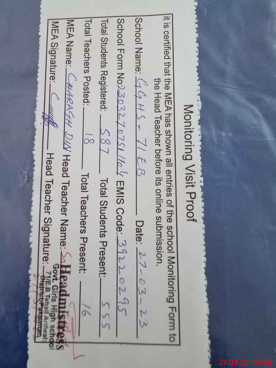 | EMIS Code: 39220295 | Name of School: GGHS 71 EB | |||