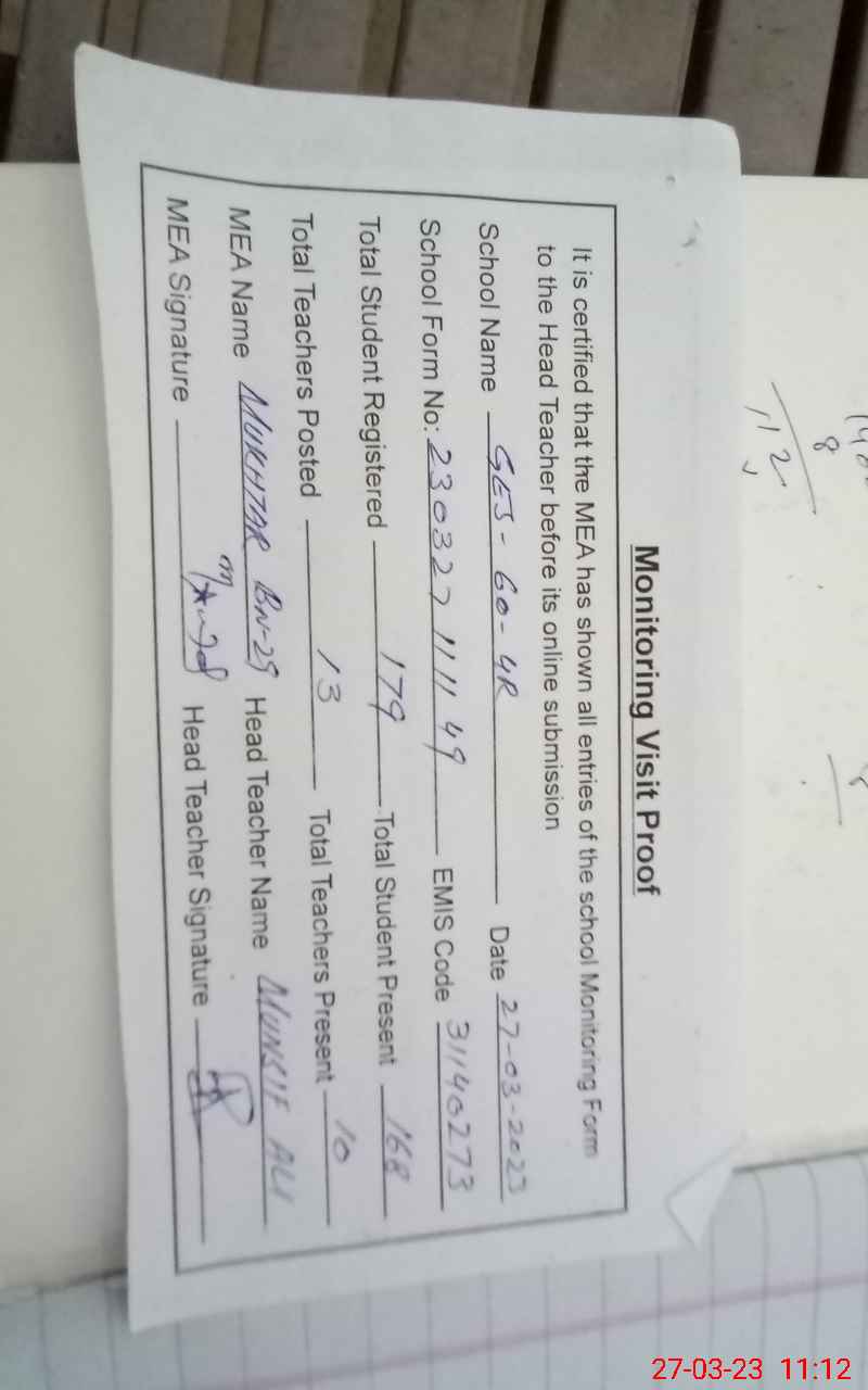 | Attendance Register | Head Teacher | MEA with School | Visit Proof |