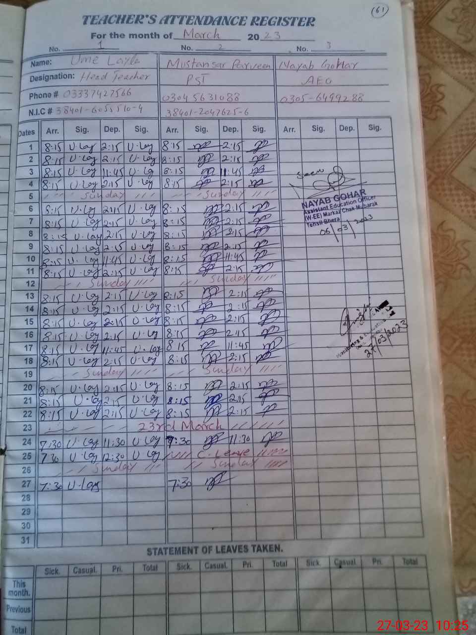 | Name: UM**** LA**** Designation: (School Headmaster's/Headmistress's) PST Phone/Cell Number: 03**** |