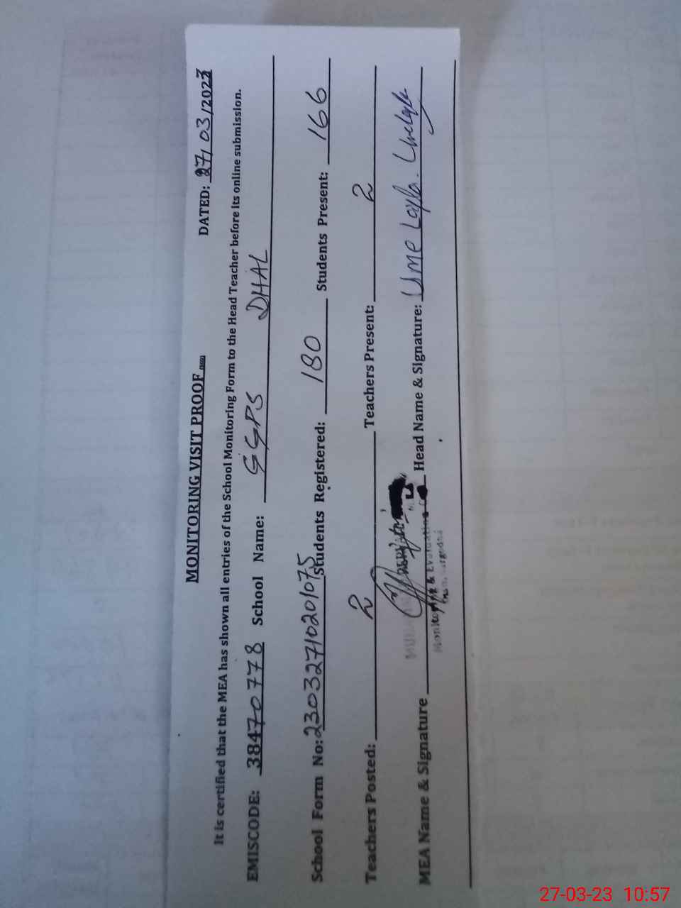 | Attendance Register | Head Teacher | MEA with School | Visit Proof |