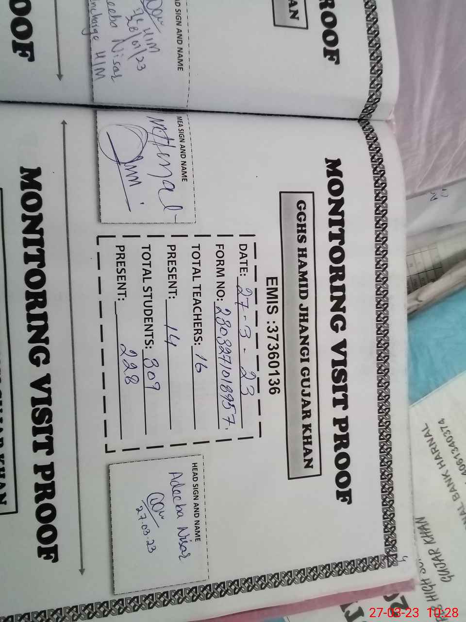 | Attendance Register | Head Teacher | MEA with School | Visit Proof |