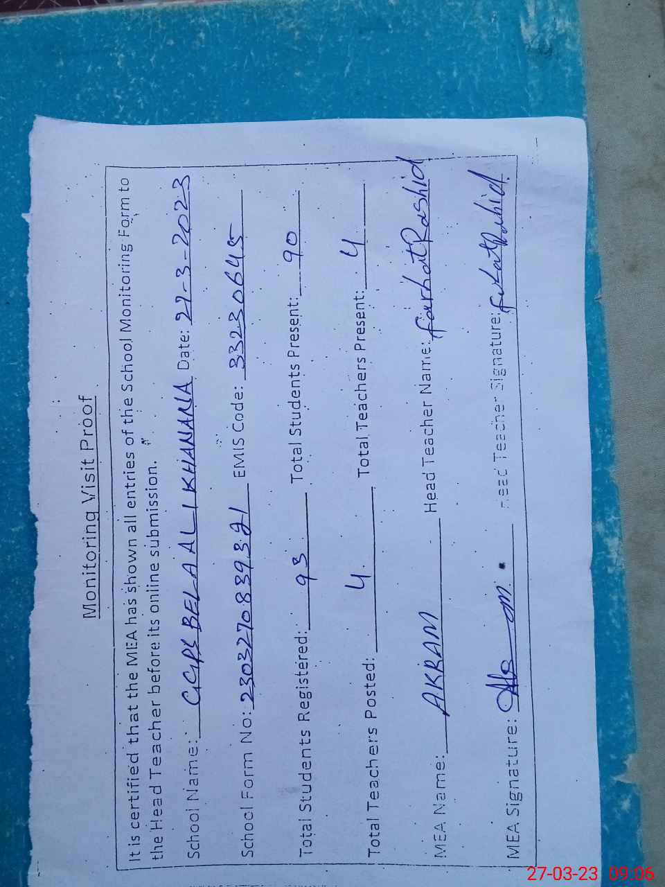 | Attendance Register | Head Teacher | MEA with School | Visit Proof |