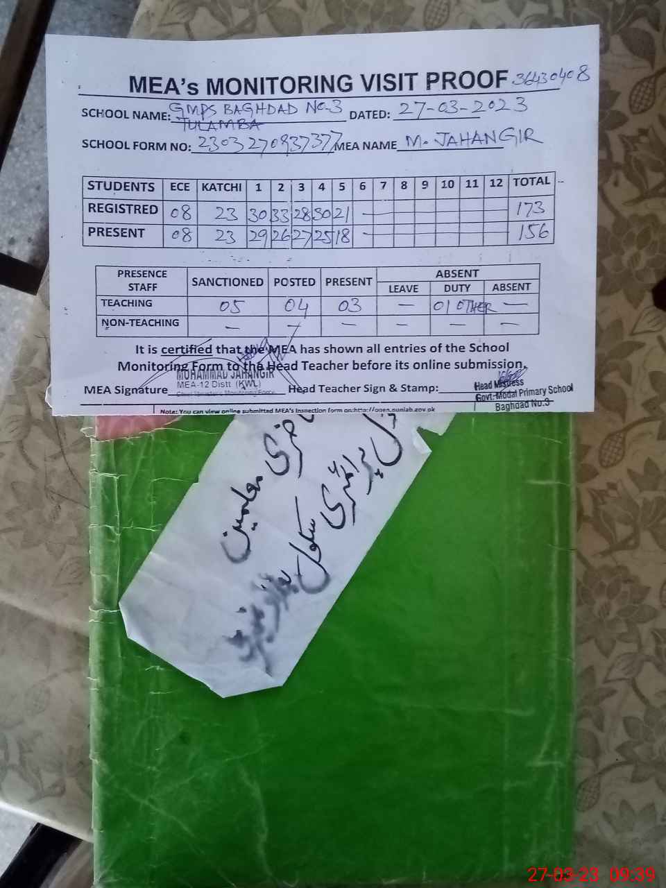 | Attendance Register | Head Teacher | MEA with School | Visit Proof |
