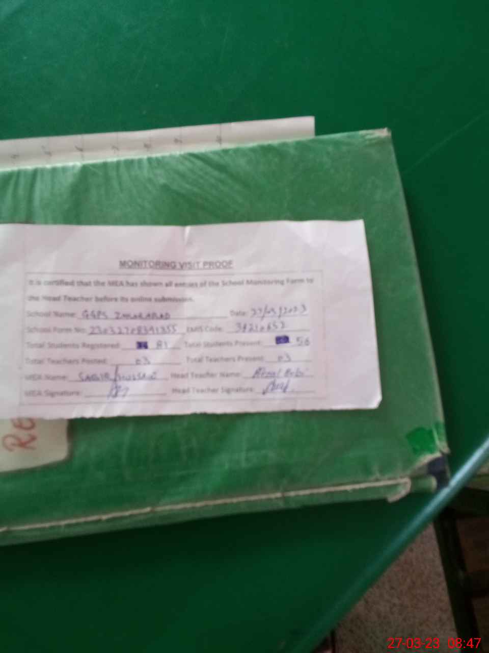 | Attendance Register | Head Teacher | MEA with School | Visit Proof |