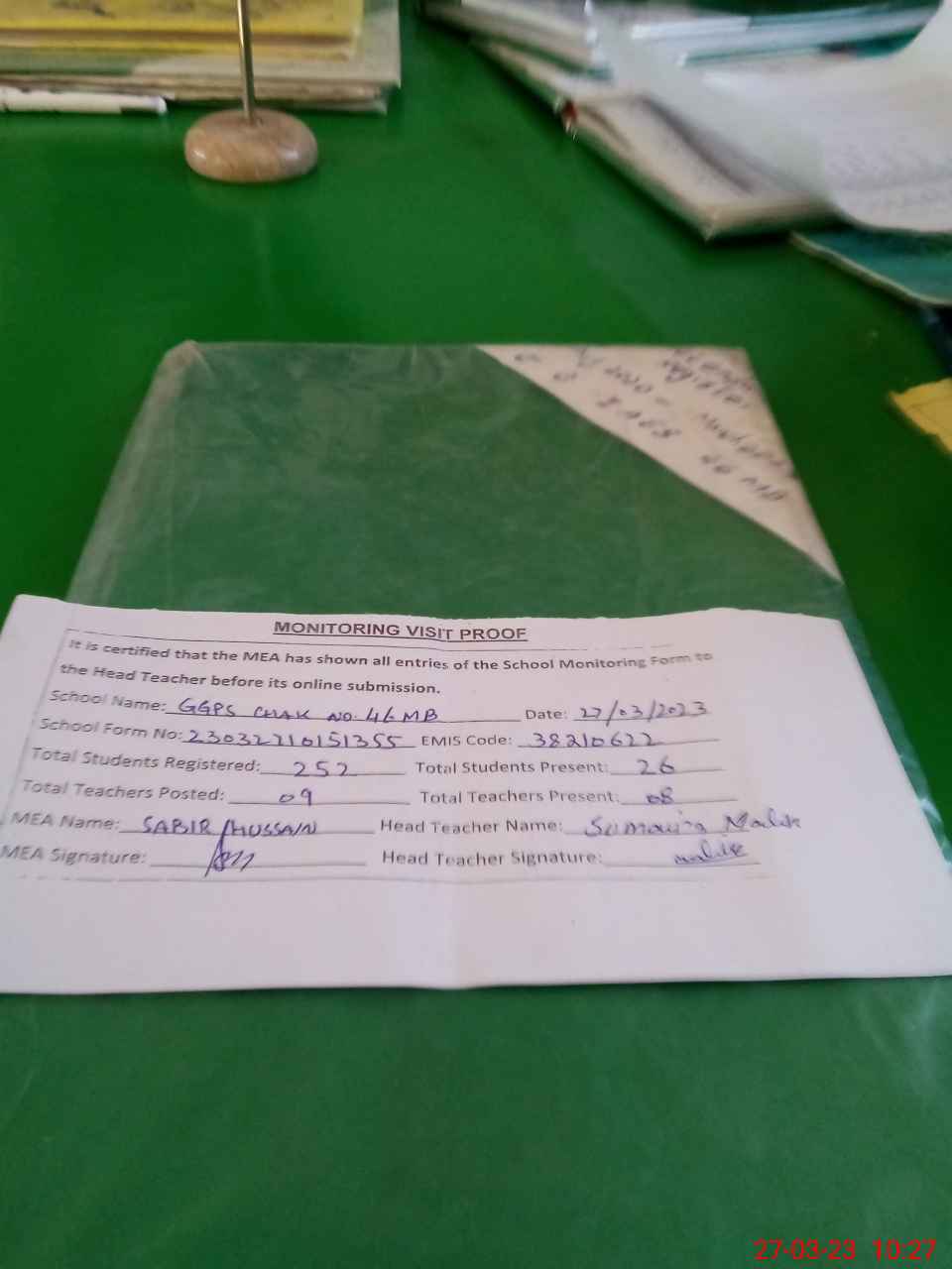 | EMIS Code: 38210622 | Name of School: GGPS CHAK NO 46 MB | |||