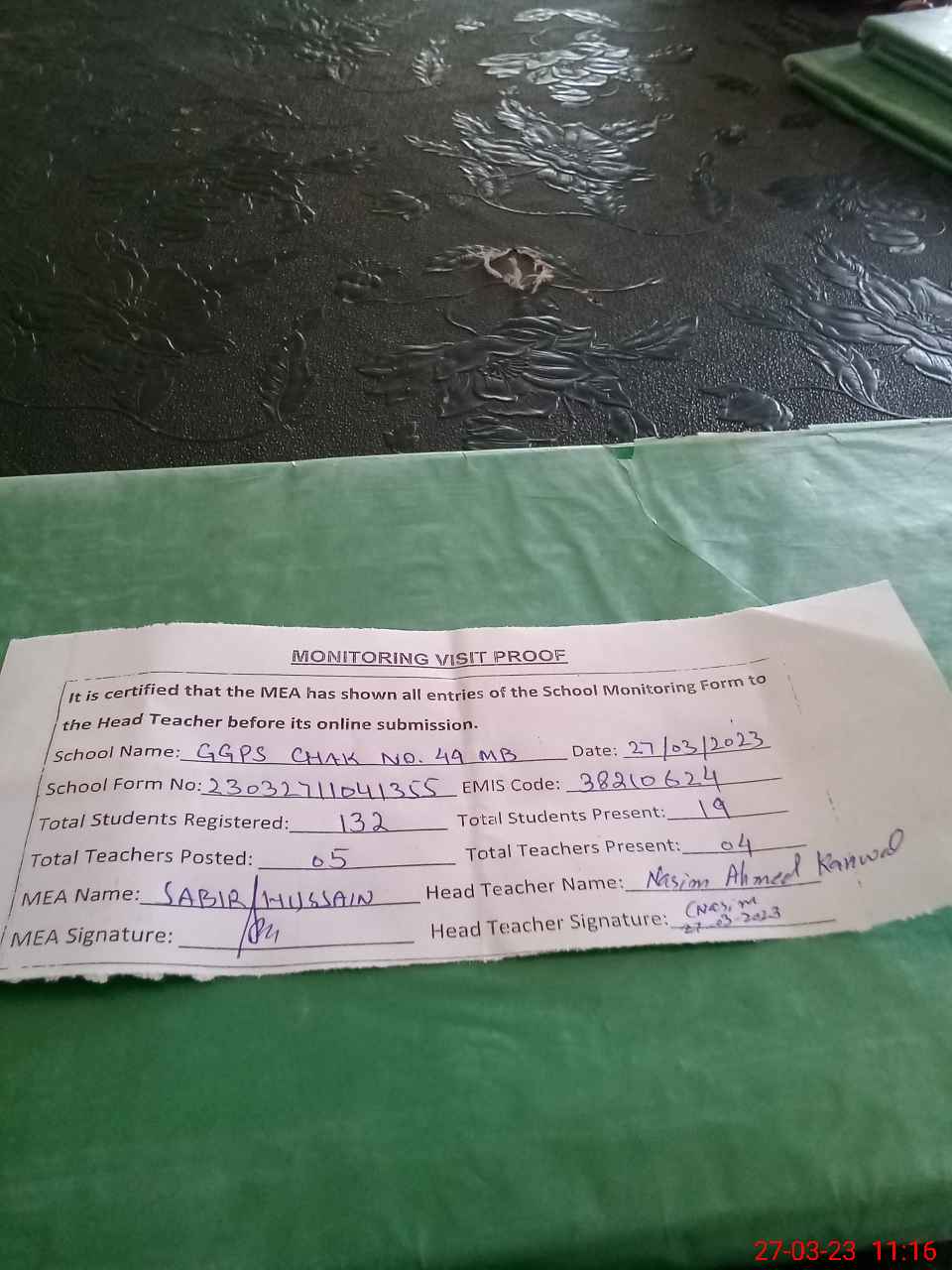 | Attendance Register | Head Teacher | MEA with School | Visit Proof |