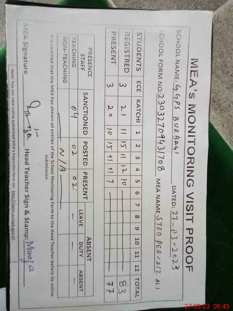 | Attendance Register | Head Teacher | MEA with School | Visit Proof |